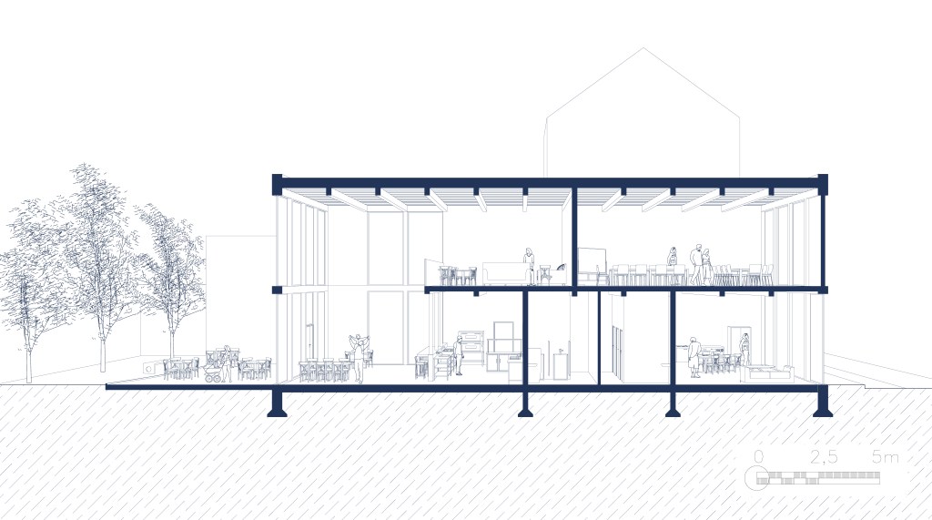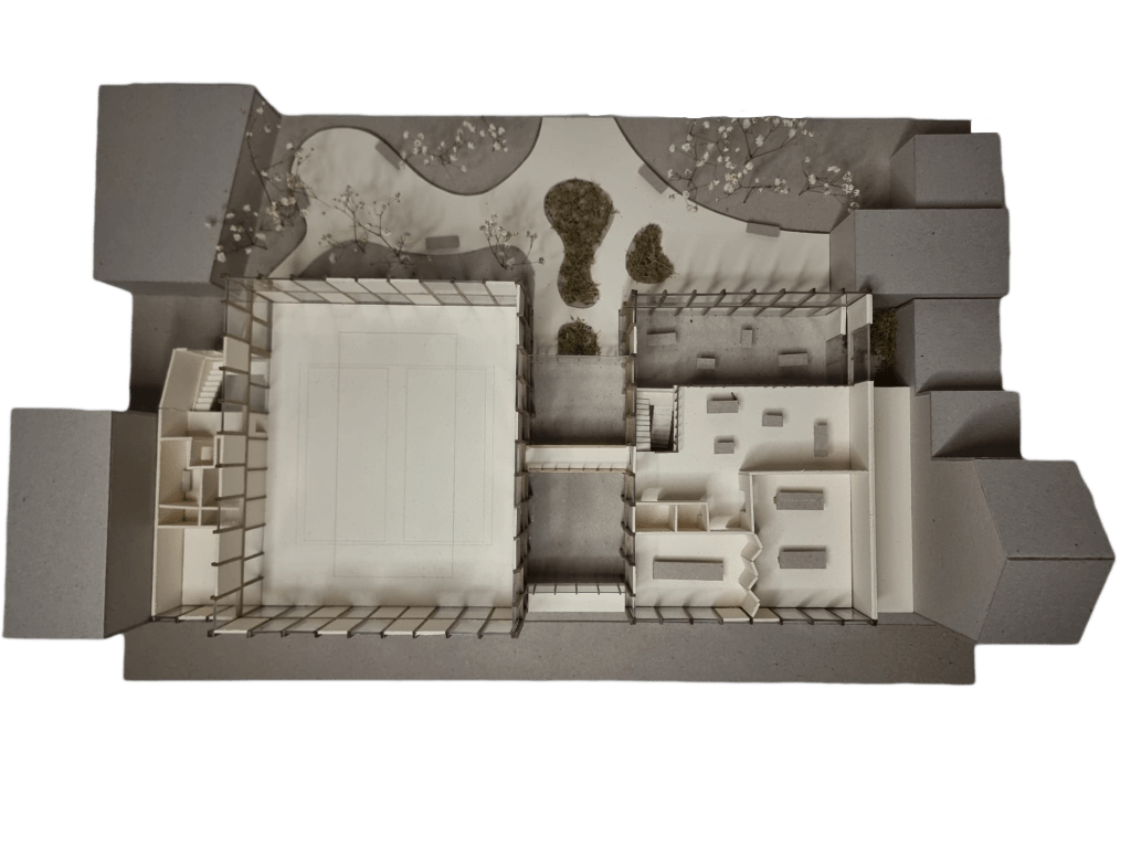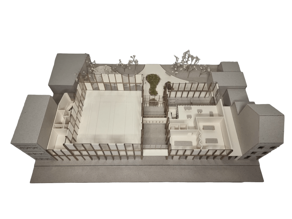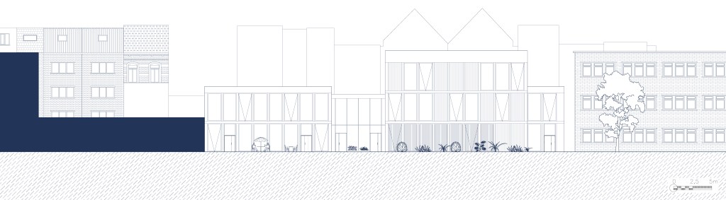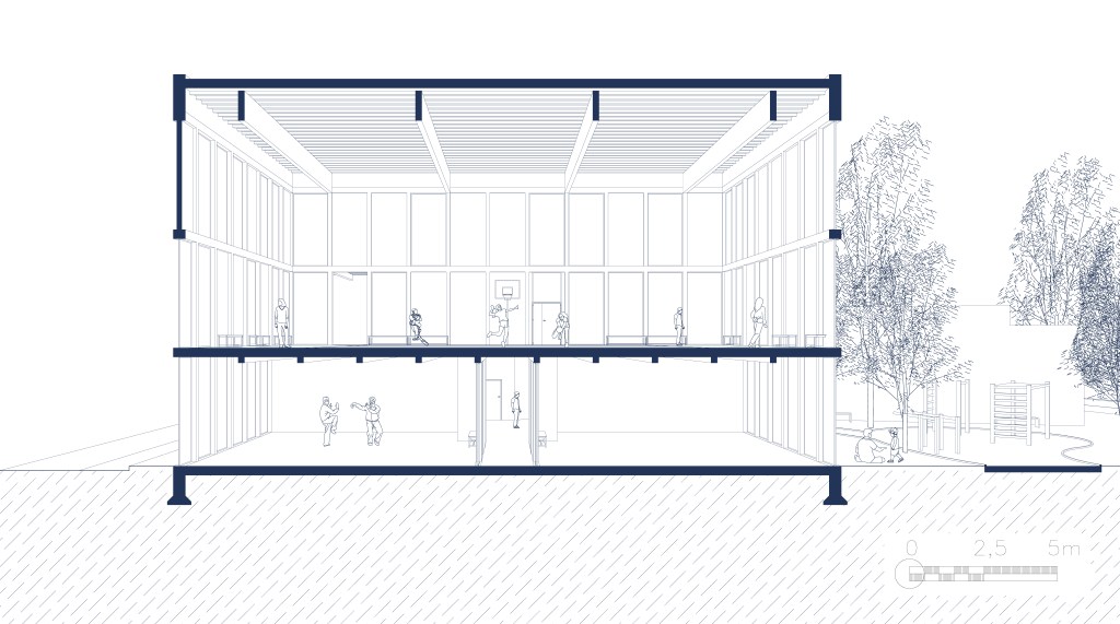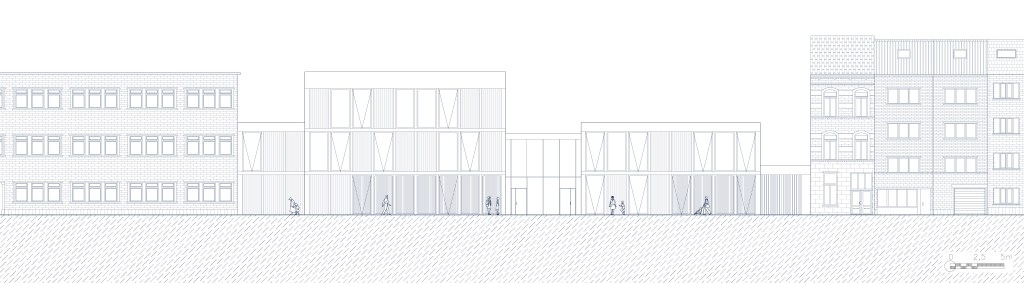 Le centre sportif et socioculturel à Schaerbeek s’inspire du découpage parcellaire du quartier, où les bâtiments sont longs et étroits. Le programme est divisé en cinq travées distinctes : une rue intérieure multifonctionnelle au centre, encadrée par une travée sportive et une travée culturelle, complétées par deux travées techniques.