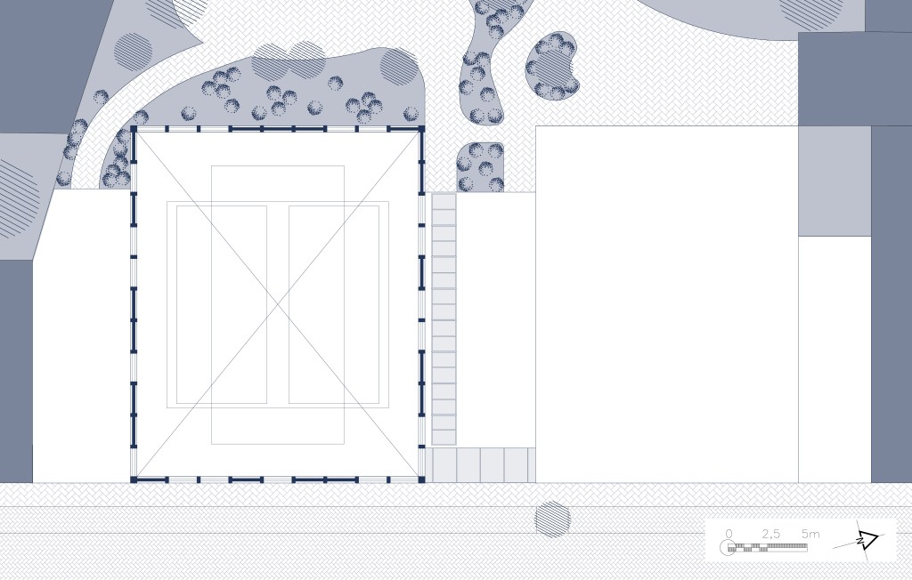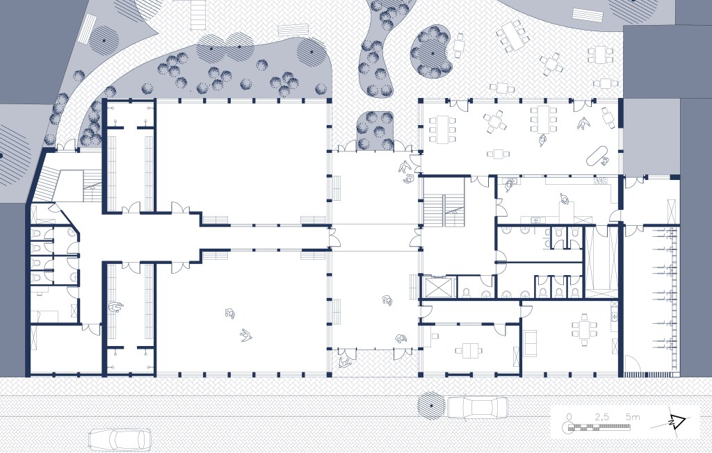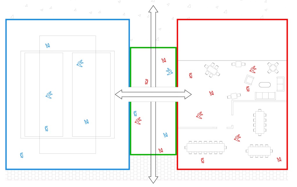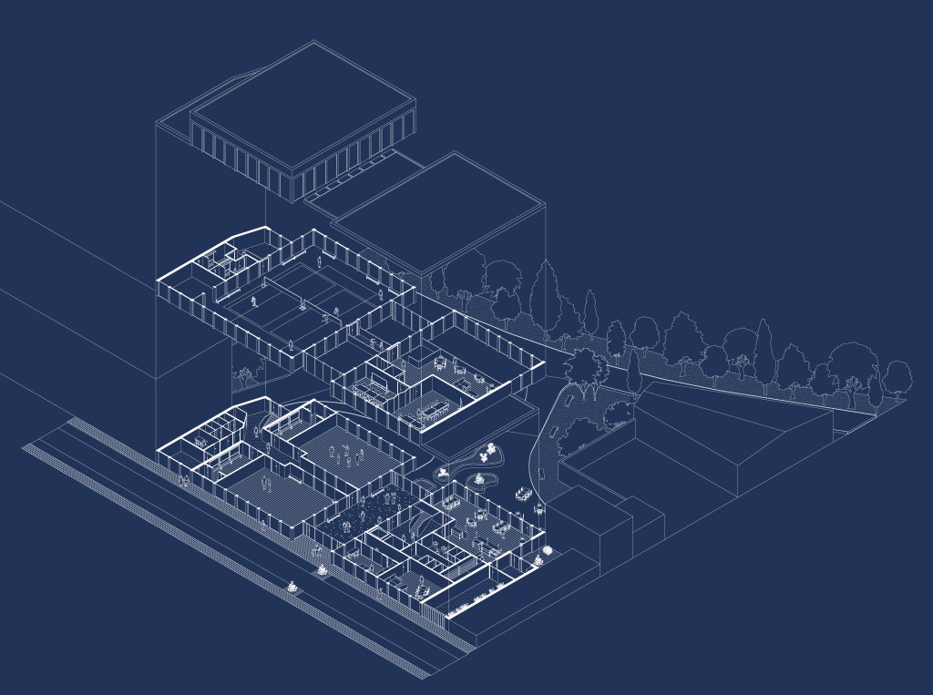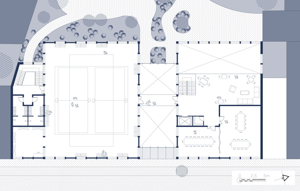 Le centre sportif et socioculturel à Schaerbeek s’inspire du découpage parcellaire du quartier, où les bâtiments sont longs et étroits. Le programme est divisé en cinq travées distinctes : une rue intérieure multifonctionnelle au centre, encadrée par une travée sportive et une travée culturelle, complétées par deux travées techniques.