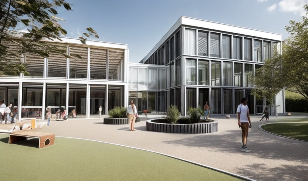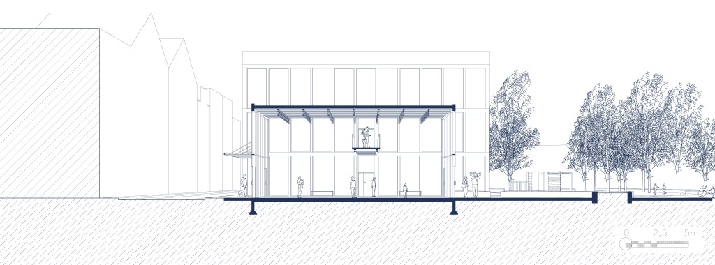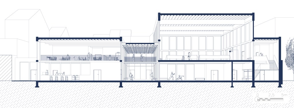 Les hauteurs des travées s’alignent sur celles des bâtiments mitoyens de la rue Jolly, tout en variant pour refléter la diversité architecturale du quartier. La rue intérieure favorise les échanges et sert de voie de circulation et de rencontre. Une passerelle relie les espaces sportifs et culturels, tandis que des façades vitrées et des murs-rideaux assurent un lien visuel avec le parc de la Senne et la rue Jolly.