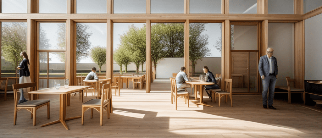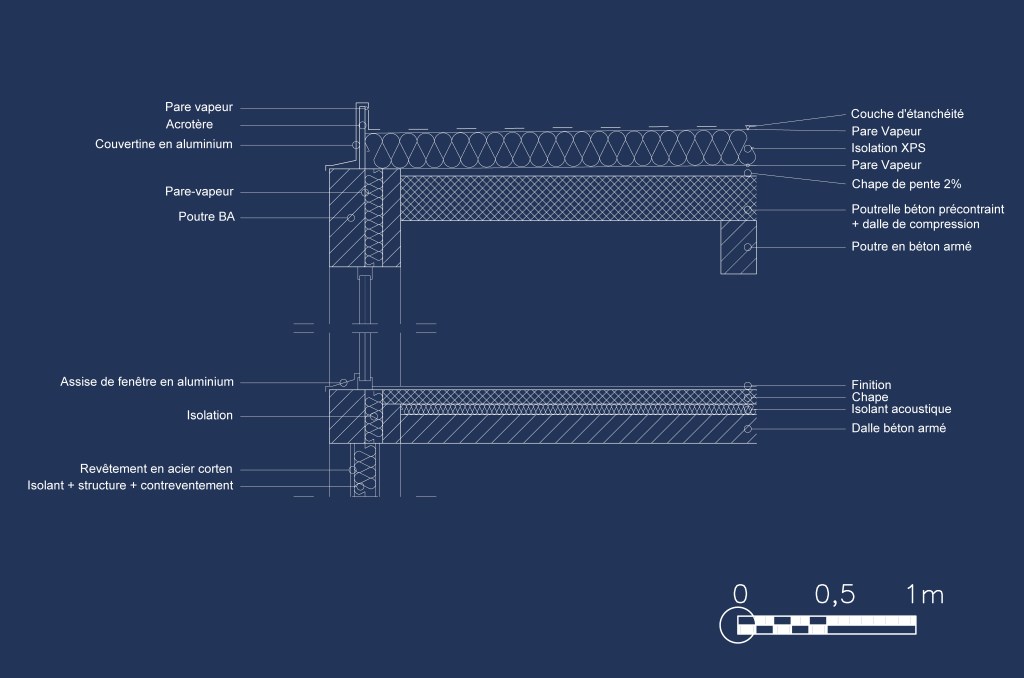 La structure repose sur un système poteaux – poutres en béton apparent en façade, formant une trame. Cette trame structurelle alterne espaces vitrés, translucides et opaques selon la fonction des travées, contrôlant ainsi les liens visuels entre intérieur et extérieur.